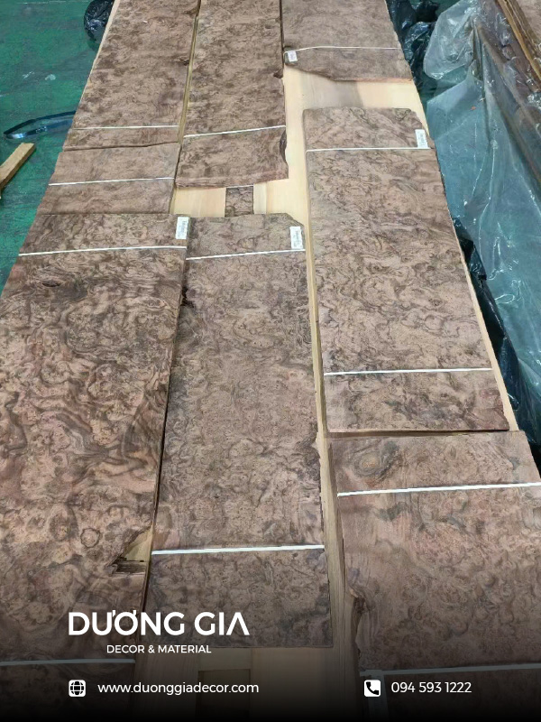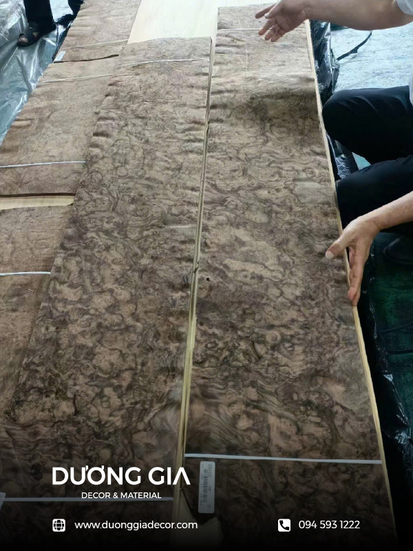 Veneer nu óc chó là lớp gỗ mỏng được lạng từ những khối nu (bướu gỗ) hình thành do quá trình tự chữa lành vết thương trên thân cây óc chó lâu năm dưới tác động của môi trường. Loại vật liệu này sở hữu hệ vân xoáy cuộn phức tạp với những điểm mắt nu dày đặc và sự tương phản màu sắc sâu sắc, tạo nên hiệu ứng thị giác 3D vô cùng ấn tượng trên bề mặt trang trí.